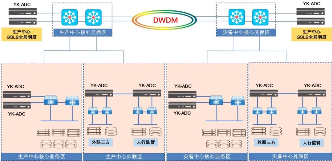 生產(chǎn)中心和災備中心為對稱部署,兩個中心使用波分技術實現(xiàn)互相連接;